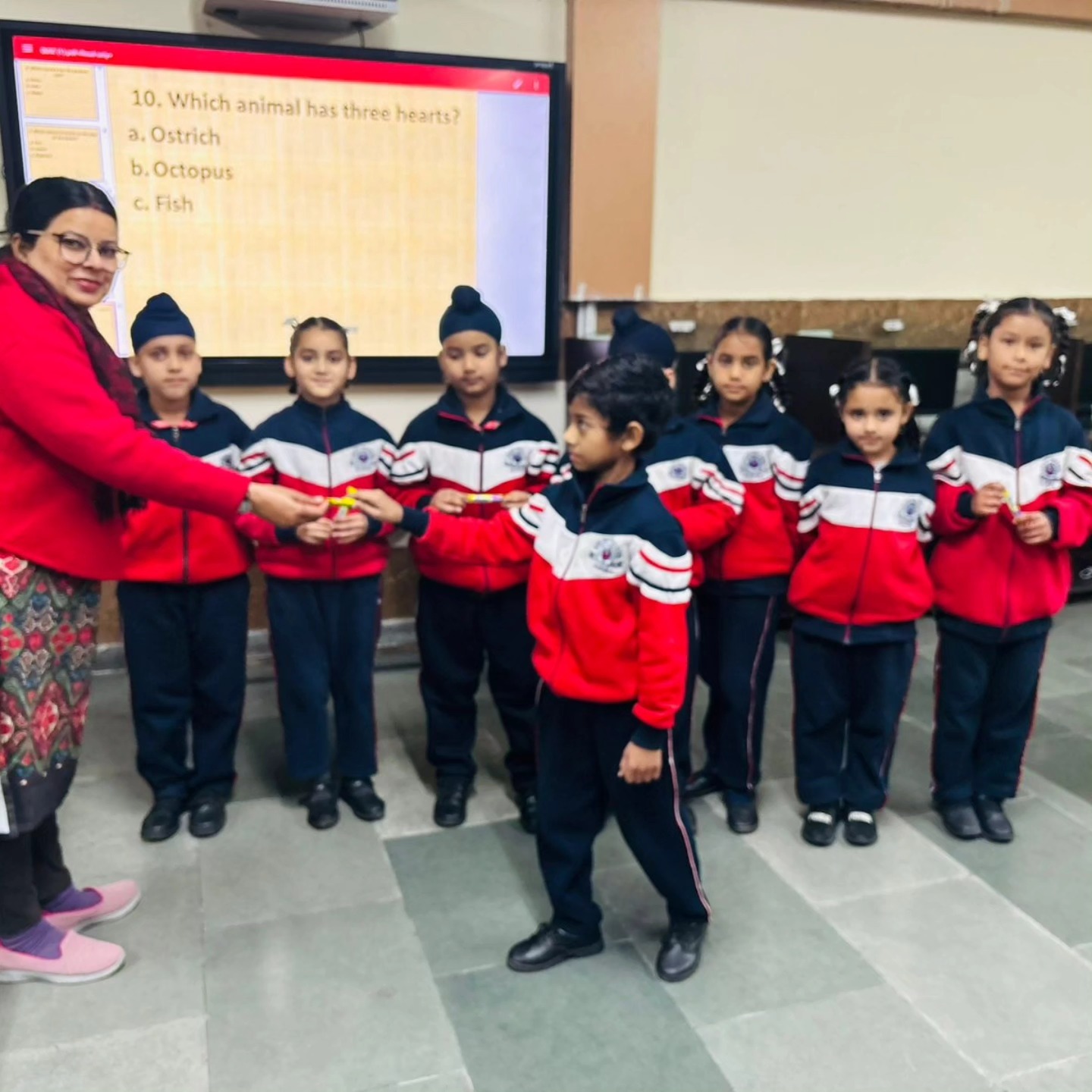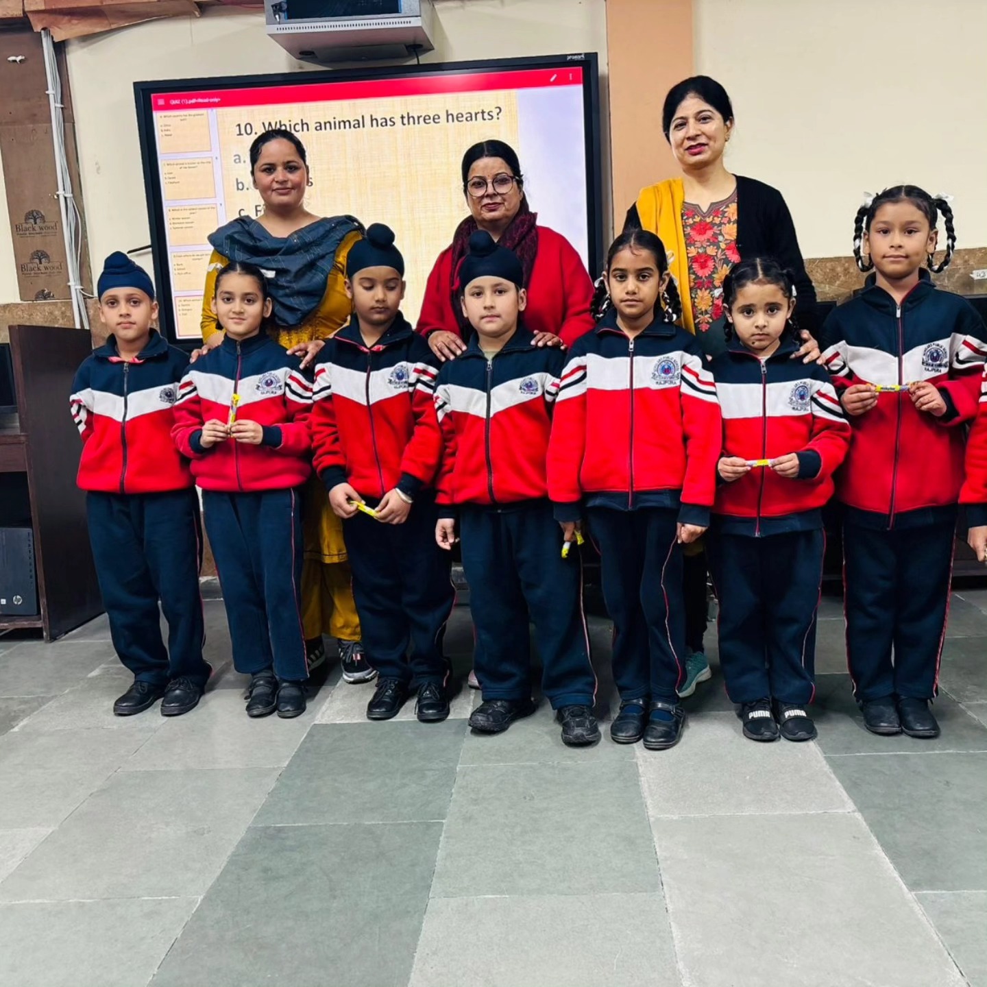The quiz included simple yet interesting questions about animals, fruits, colours, national symbols, and our country. The main objective was to enhance children’s awareness, strengthen their thinking abilities, and boost their confidence from an early age.